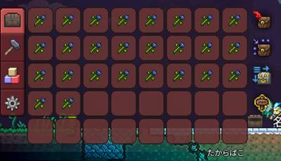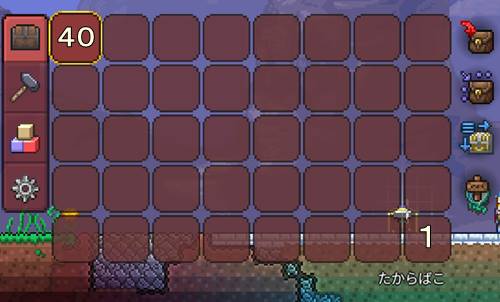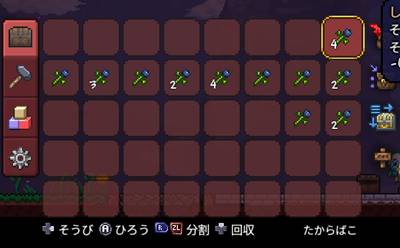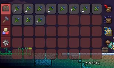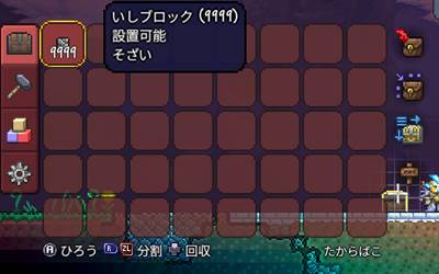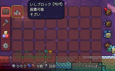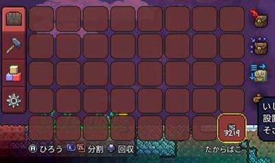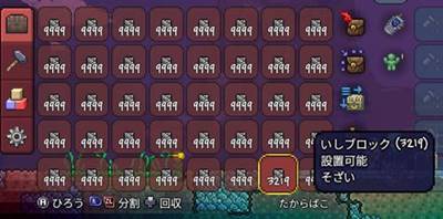 しかしテラリアをずっとプレイしていた方ならこちらの違和感に気がつくかも知れませんが、2のスタック機能がちゃんと働いている場合には左上の端の枠の右隣の枠に3219個の「いしブロック」が入らないとおかしいんです。左上の端がスタックの上限になったんですから、その右隣りにはみ出した分が入るのが「まとめる」の機能なんですからね。それにさらに言うと、手持ちにもっと「いしブロック」があるのでそちらも入ってもいいはずなんです。
