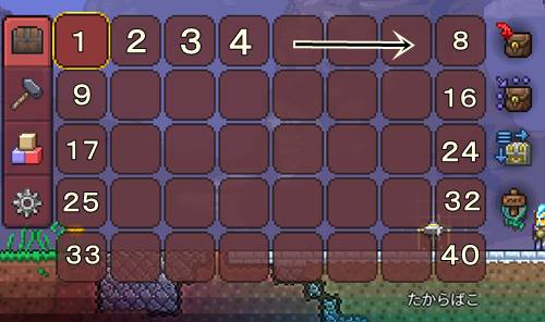 こちらがテラリアの宝箱にアイテムが入る順番です。意識しないでプレイしてる方が多い気もしたので、今回画像を作りました。左上の端が最初に入る場所なので、1ですね。次はその右隣りで2、次もその右隣りで3、と進んでいき8まで行ったら左端に折り返して9になります。あとはその順番で、右端の下が最後の40です。