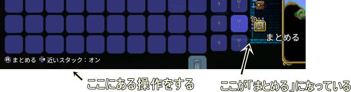 こちらはコマンドが「まとめる」の状態の時の画面です。右の矢印で示した所が「まとめる」になっています。このアイコンでAボタンを押すと「まとめる」という操作が出来るので、アイテム欄にある物で条件に合った物が「たからばこ」に勝手に入ります。前はこれしか無かったのですが、それが今度からは「十字ボタンの右」を押すと「近いスタック」に切り替えができます。