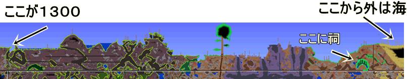 この地図の左端が1300フィートの場所に掘った縦穴で、右側の端の外は海なので画像を切ってあります。下の方の白っぽい線が「深度0」の所に掘った通路の線なので、ここから上だけ探せばいいです。そうして見つけた「祠」は、このワールドではかなり右よりでした。この地図くらい広くすると多少「祠」がわかりにくいですが、上に貼った「祠」の地形を参考に探せば見つかるはずです。