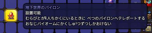 個人的には「パイロン」が2種類追加と聞いたので、「地下世界」と「宇宙」かと予想をたてましたが、「地下世界」はアタリで「宇宙」の方はハズレでした。「宇宙」は釣りクエストの事を考えるとあった方がいいと思うのですが、難しいんでしょうかね。