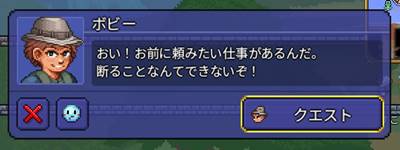 こちらがアプデで顔のグラフィックが付いたNPCとの会話の画像です。こちらはテラリアNPCでは唯一の子供である「つりびと」のボビーです。この画面の顔のグラフィックの下にあるアイコンの右側の物が幸福度を知りたい時に押すボタンです。これを押すと「どの場所が好きか」という事と「どのNPCが好きか」という事をランダムなセリフで教えてくれるんです。以前はこれを元に相性のいいNPCを推理して、そのNPCと好きな場所に2人で隔離して「パイロン」を売ってもらっていました。