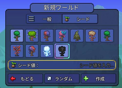 こちらは「ノーマル」のワールドや「特殊シード」のワールドに、新しい特徴を足すことができる「シード値」です。入力方法は今まで書いてきた記事と同じで